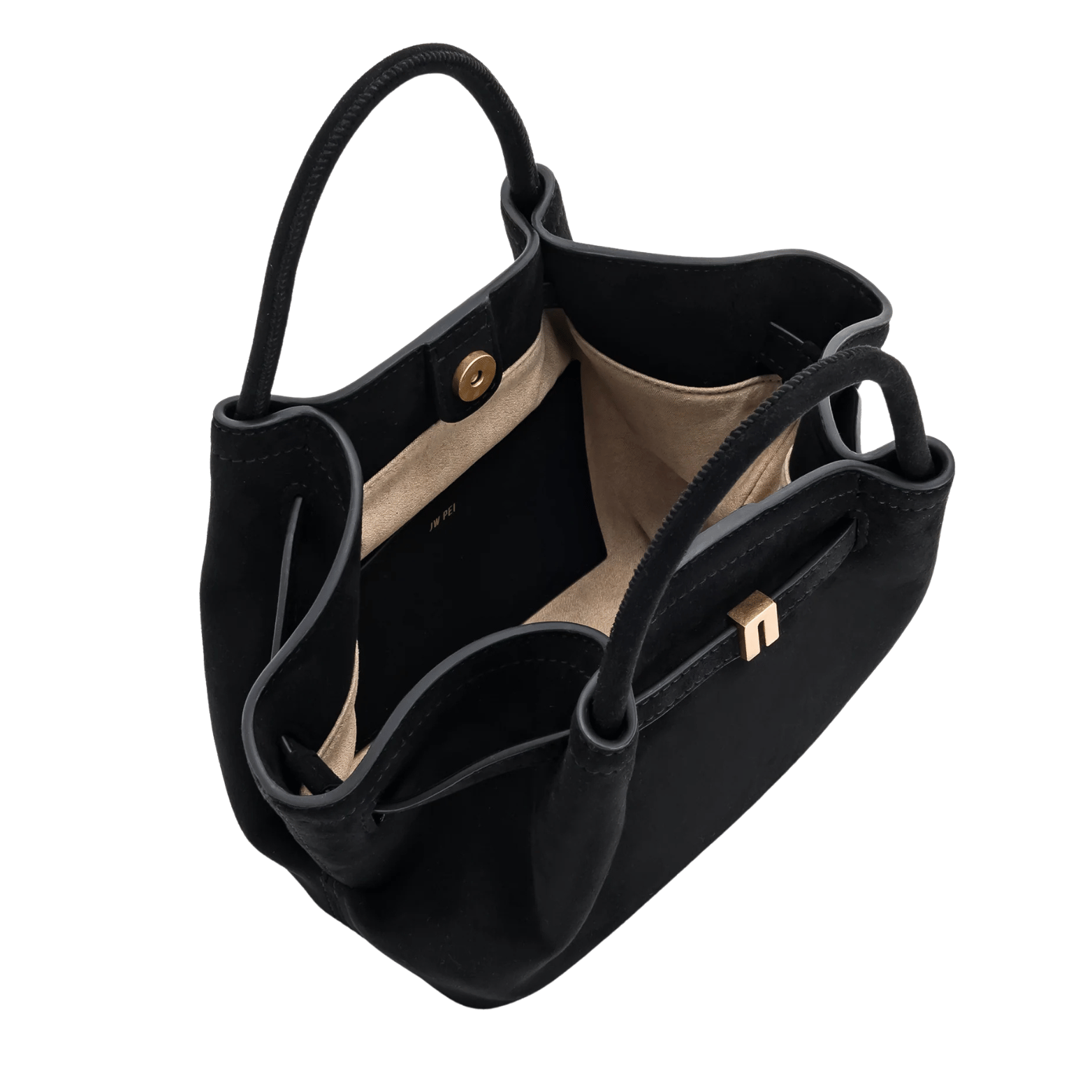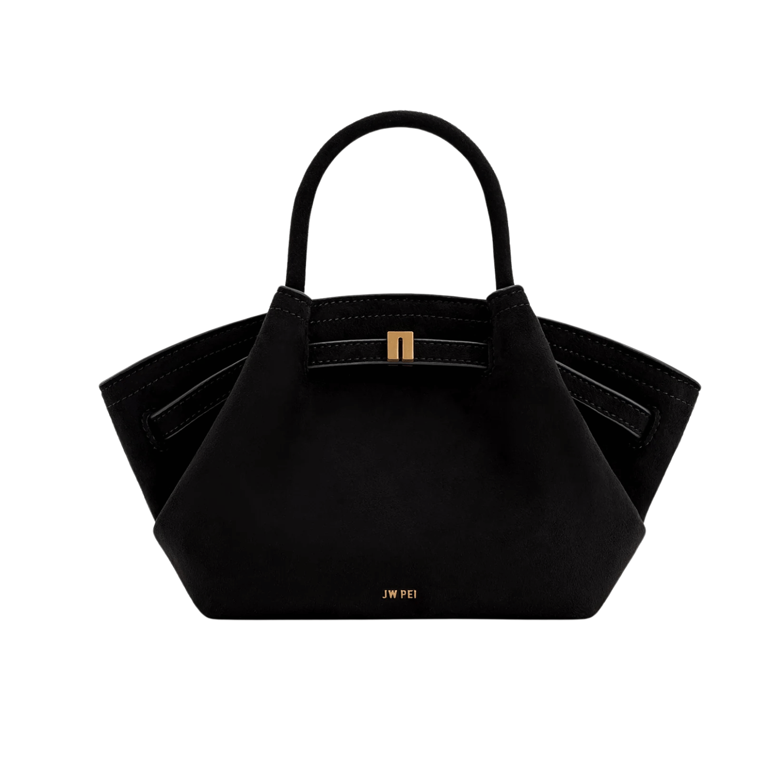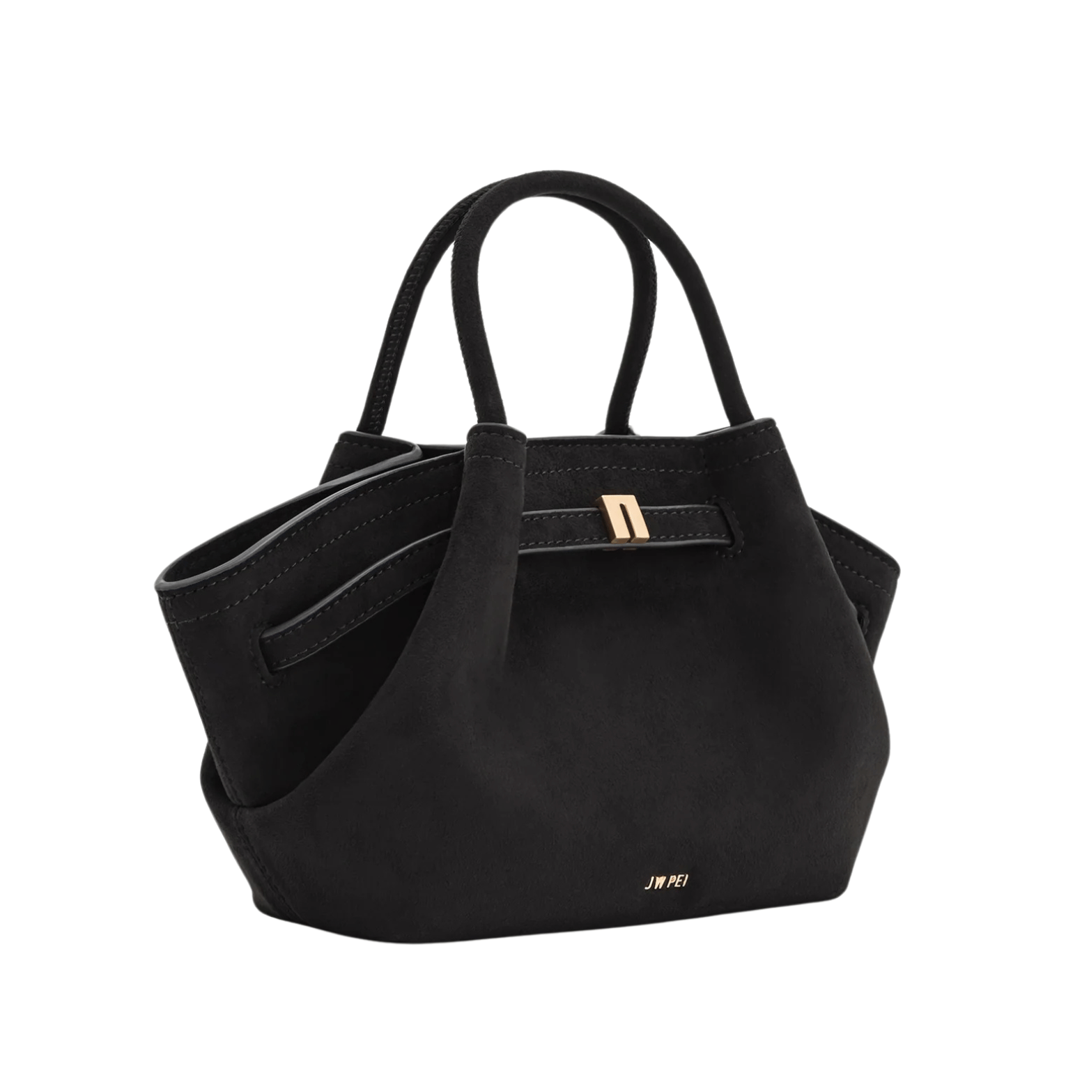 Hana Mini Tote Bag In Black Faux Suede by Jw Pei is a tote designed for daily use, combining open, accessible space with a refined, simple aesthetic.